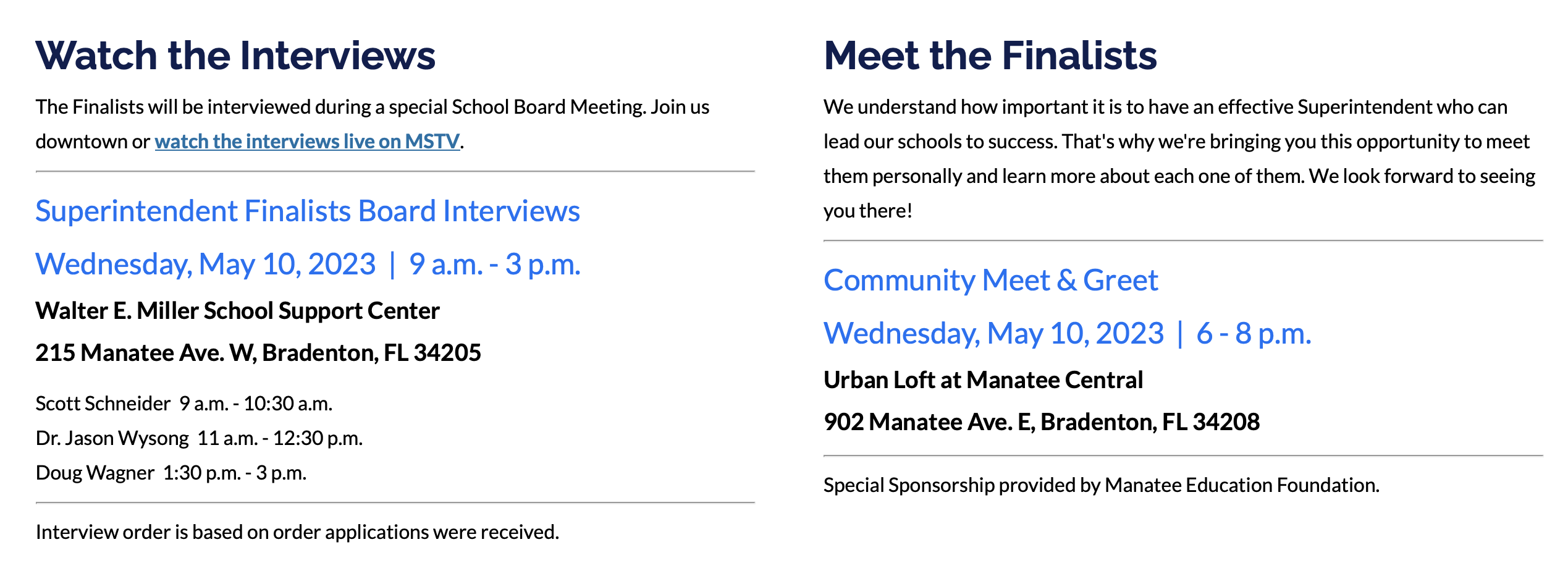 With the final selection for School Superintendent scheduled for May 16, the School Board of Manatee County has arranged two ways to get to know the 3 finalists better next week. As seen in the graphic below, the in-person interviews will be televised live, next Wednesday, May 10 between 9am-3pm on MSTV. To watch these interviews next week, just click this link.